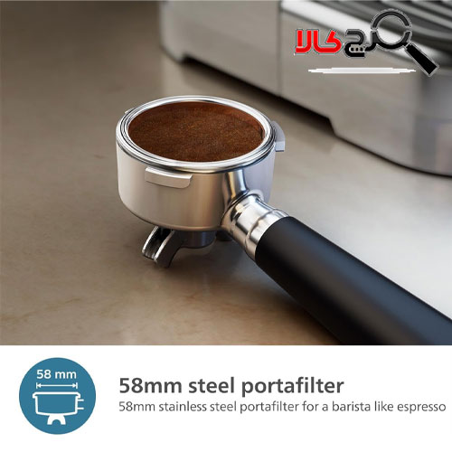 پورتافیلتر ۵۸ میلیمتری: از لذت یک فنجان قهوه و نوشیدنی لذیذ که مستقیماً از طریق پورتافیلتر از جنس استیل ضدزنگ ۵۸ میلیمتری حرفهای و سبدهای تک و دو جداره به دست شما میرسد، لذت ببرید. این ابعاد پورتافیلتر به شما این امکان را میدهد که یک اسپرسوی زیبا با فوم شیر خوشبو ایجاد کنید.