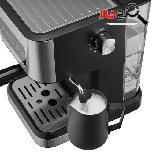 روی بالای بدنه، صفحهنمایشگر دیجیتال با پنل لمسی قرار دارد که دارای دکمههای روشن/خاموش، انتخاب بخار، تنظیمات دستی، اسپرسو سینگل و اسپرسو دوبل است. با استفاده از دکمه چرخشی، میتوانید قدرت بخار نازل را تنظیم کنید. یک مخزن آب 1.5 لیتری در پشت بدنه دستگاه قرار دارد که از جنس پلاستیک شفاف است تا بتوانید میزان آب داخل آن را به راحتی مشاهده کنید.