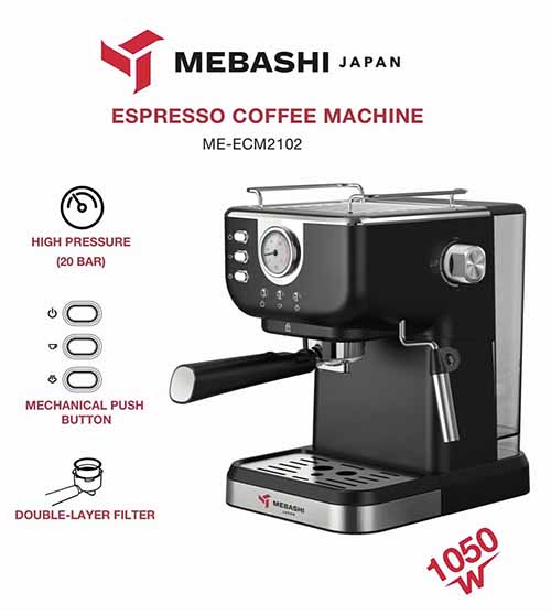 اسپرسو ساز مباشی مدل ME-ECM 2102 از جمله اسپرسو ساز های بسیار زیبا و شیک برای استفاده در منزل است. این دستگاه با توان ۱۰۵۰ وات و فشار بخار ۲۰ بار تولید شده است. مخزن آب این اسپرسو ساز دارای ظرفیت ۱.۵ لیتری است و به راحتی جدا می‌شود.