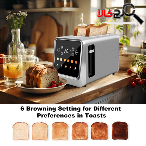این دستگاه به صورت جمع و جور و سبک طراحی شده است که فضای کمی از آشپزخانه را اشغال میکند. بدنه توستر از جنس استیل ضد زنگ با کیفیت بالا ساخته شده که دوام و طول عمر طولانی دارد. این توستر دارای 2 درگاه برای قرار دادن نان است و شما میتوانید به صورت همزمان 2 برش انواع نان را گرم و تازه کنید.