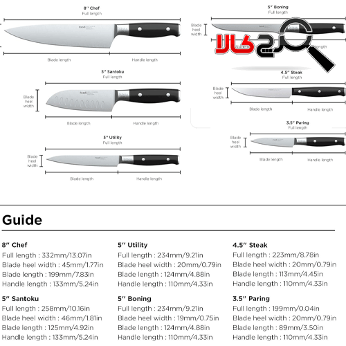 این مجموعه شامل تمامی چاقوهای ضروری است که هر آشپزی به آن نیاز دارد: چاقوی سرآشپز (Chef’s Knife) برای برشهای همهکاره، چاقوی نان دندانهدار برای برش نانهای ترد بدون له کردن بافت داخلی، چاقوی سانتوکو (Santoku) برای برشهای دقیق سبزیجات، چاقوی کاربردی (Utility Knife) و چاقوی پوستکن (Paring Knife) برای کارهای ظریف، و همچنین چاقوهای استیک (Steak Knives) برای سرو میز. این تنوع تضمین میکند که برای هر نوع ماده غذایی، از یک چاقوی با عملکرد تخصصی استفاده شود.سرویس چاقو 14 پارچه نینجا