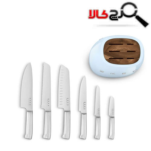 با این مجموعه 7 تکه بلوک چاقو، می‌توانید استایل کلاسیک SMEG و ظاهری قدیمی دهه 1950 را به میز آشپزخانه خود اضافه کنید! بلوک چاقو اقاقیا دارای بدنه‌ای از فولاد کربنی با پوشش پولیش است که به راحتی تمیز می‌شود و به رنگ کرم براق تزئین شده است تا با دیگر لوازم رنگی SMEG همخوانی داشته باشد. پایه‌های ضد لغزش از لغزش بلوک هنگام برداشتن چاقو جلوگیری می‌کنند. چاقوهای این مجموعه دارای تیغه‌های با کیفیت استیل ضد زنگ آلمانی و دسته‌های فولادی ضد زنگ صیقلی و بسیار مقاوم هستند و مناسب برش انواع مواد غذایی در کارهای روزمره می‌باشند. این مجموعه شامل چاقوی سبزیجات، چاقوی چند منظوره، چاقوی گوشت، چاقوی سانتوکو، چاقوی نان و چاقوی آشپزی می‌باشد.
