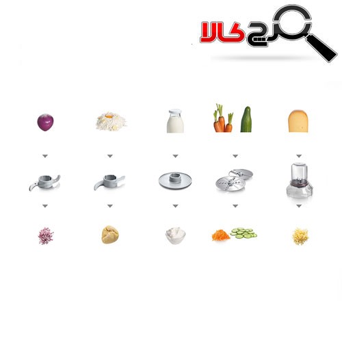 این مدل غذاساز یخ خردکن، آب مرکبات گیری، آبمیوه گیری، چرخ گوشت، خردکن کوچک ندارد اما آسیاب نیز دارد. تعداد دیسک رنده این دستگاه، 2 عدد بوده و دارای