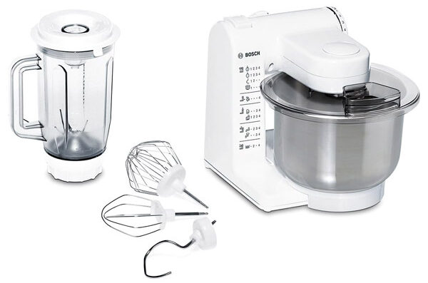 ماشین آشپزخانه بوش دارای یک پارچ مخلوط کن با ظرفیت 1 لیتر است که از جنس پلاستیک مستحکم تولید شده است و به راحتی شما می توانید انواع نوشیدنی ها و اسموتی های مختلف را آماده کنید. این محصول همچنین دارای 3 سری مختلف همزن شامل؛ همزن، میکسر خمیر و همزن مواد خشک است. تمامی سری های این دستگاه با قابلیت چرخش 360 درجه طراحی شده اند.